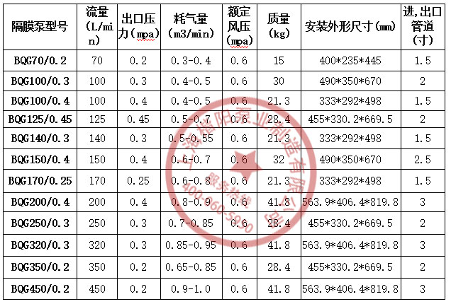 礦用氣動BQG隔膜泵性能參數