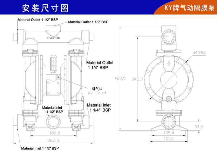 KY261-115不銹鋼氣動隔膜泵是上海楷陽泵業不斷吸取和學習進口高端氣動隔膜泵的經驗研發成功的最新型國產KY氣動隔膜泵。在泵體和配氣裝置都有革命性的改進,具有無死點、效率高、流量大等特點。廣泛應用于制藥、污水處理、食品、化工、汽車、涂料等行業。水泵的材質有鑄鐵、不銹鋼304氣動隔膜泵、不銹鋼316L氣動隔膜泵等,隔膜片選用高壓復合特氟龍材質,密封座采用不銹鋼材質。KY不銹鋼氣動隔膜泵自吸能力干吸可以達到5米,濕吸8米,在工作壓力8公斤時還可以保證足夠流量輸出。壓濾機板框正常工作需要7公斤左右的壓力才可以正常出泥餅,一般不銹鋼氣動隔膜泵達到7公斤壓力時容易有流量低、效率下降等問題,這時更體現了KY261壓濾機隔膜泵的優勢。因為KY261不銹鋼氣動隔膜泵的特點就是壓力足,在高壓時可以有更大流量,所以大家都稱它是壓濾機隔膜泵。