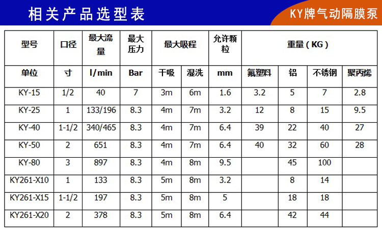 8.KY牌不銹鋼氣動隔膜泵吸力好,壓力足,在高壓力工況下仍可以保證較大流量,適用于作為板框、廂式壓濾機的進料泵。